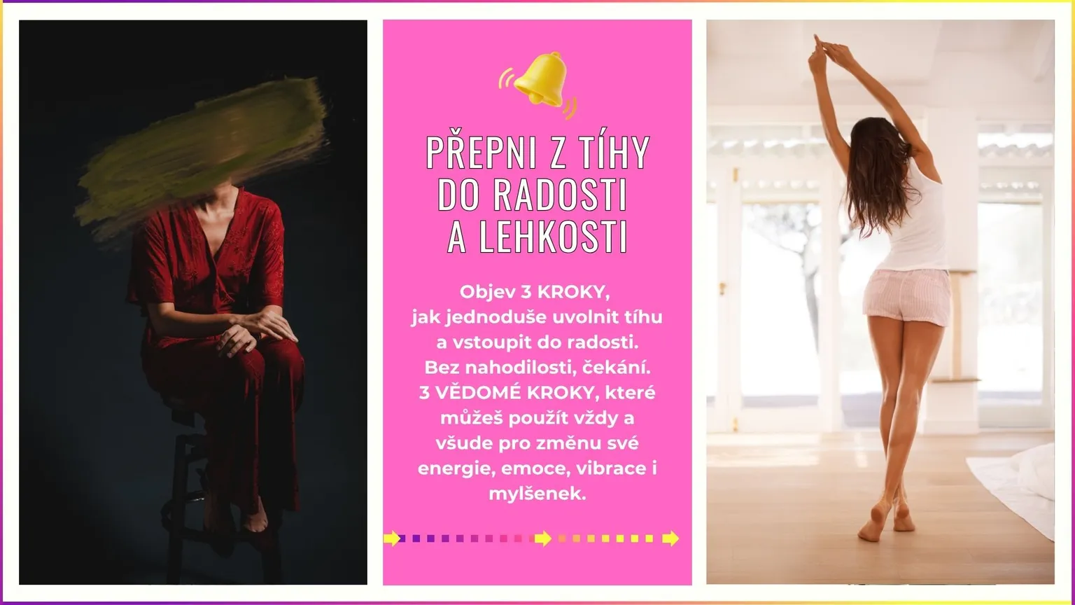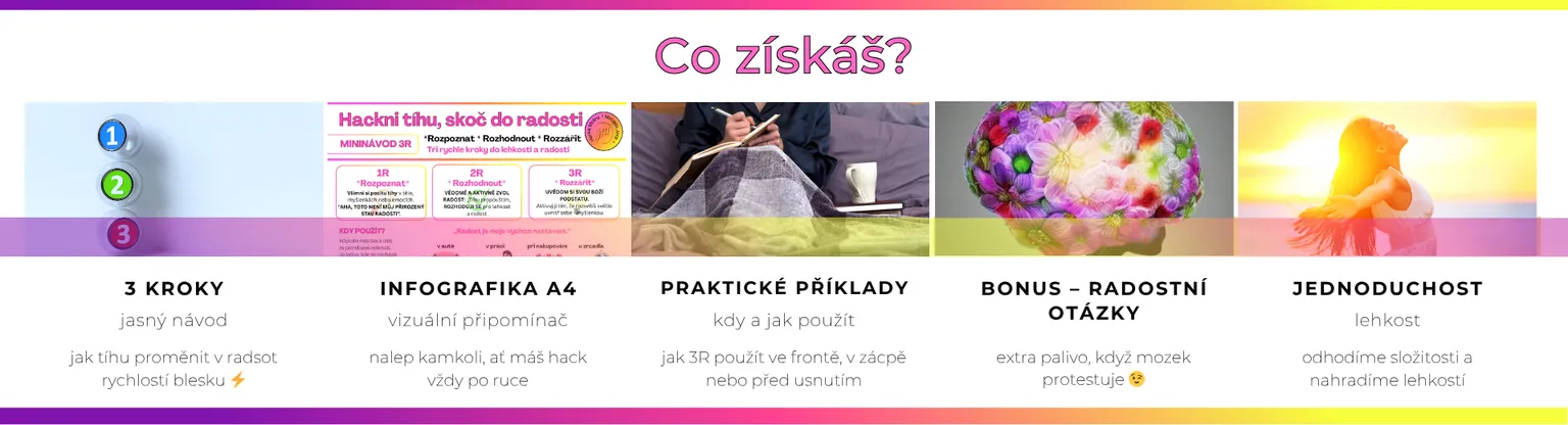 Proto vznikl mini-eBook „Hackni tíhu, skoč do radosti“ – aby ses ZBAVILA TLAKU dřív, než se rozjede vnitřní kritik, a přepnula do radosti rychlostí blesku. Bez tabulek, bez hodin terapie, bez pocitu „musím“.